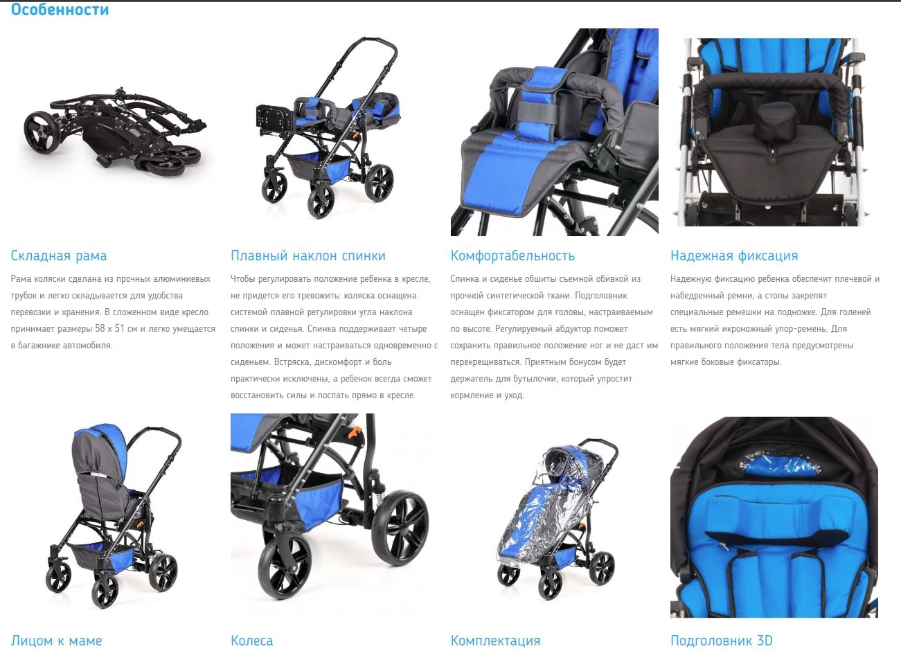 Подголовник 3D регулируется по высоте. Сиденье коляски оснащено мягкими боковыми поддержками бедер и тела, а также мягким абдуктором для ног, что обеспечивает правильное положение в коляске. Подножки коляски имеют фиксирующие ремни для стоп и регулируются по высоте, по углу наклона. Коляска оснащена плечевыми ремнями и ремнем, фиксирующим бедра, позволяющими надежно поддерживать ребенка. Передние колеса вращающиеся с возможностью блокировки и быстрого снятия. Амортизированные быстросъемные задние колеса оснащены системой тормозов.